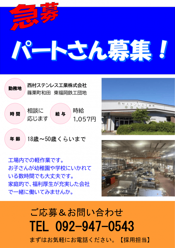 2026/04/16 パートさん急募! こんにちは!西村ステンレス工業でございます。 現在、パートさんを募集しております! 工場内での軽作業ですので、経験は問いません。 お子さんが幼稚園や学校に行かれている数時間でも大丈夫です。 ご応募・お問い合わせ、お待ちしております♪